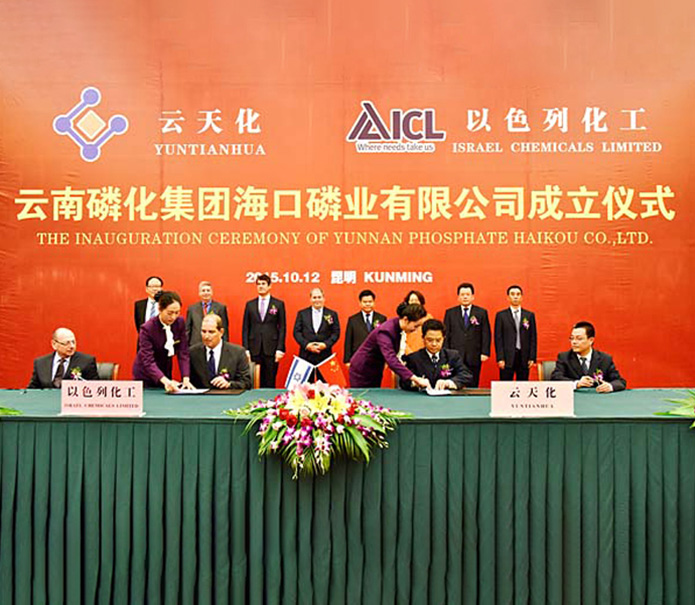 2015年10月12日,云天化集團(tuán)和以色列化工集團(tuán)的合資合作項(xiàng)目——云南磷化集團(tuán)海口磷業(yè)有限公司在昆明海埂花園酒店舉行成立儀式。